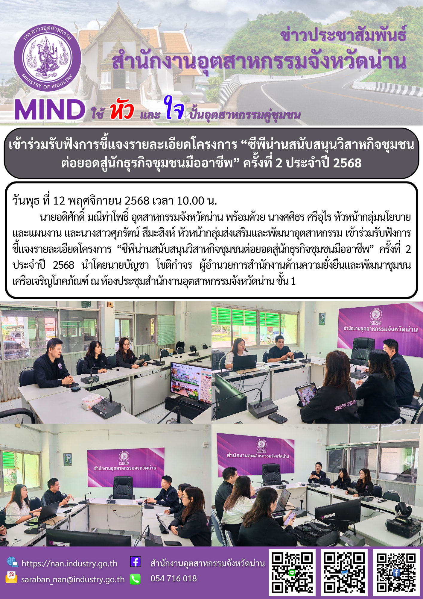 วันพุธ ที่ 12 พฤศจิกายน 2568 เวลา 10.00 น. นายอดิศักดิ์ มณีท่าโพธิ์ อุตสาหกรรมจังหวัดน่าน พร้อมด้วย นางศศิธร ศรีอุไร หัวหน้ากลุ่มนโยบายและแผนงาน และนางสาวศุภรัตน์ สีมะสิงห์ หัวหน้ากลุ่มส่งเสริมและพัฒนาอุตสาหกรรม เข้าร่วมรับฟังการชี้แจงรายละเอียดโครงการ “ซีพีน่านสนับสนุนวิสาหกิจชุมชนต่อยอดสู่นักธุรกิจชุมชนมืออาชีพ” ครั้งที่ 2 ประจำปี 2568 นำโดยนายบัญชา โชติกำจร ผู้อำนวยการสำนักงานด้านความยั่งยืนและพัฒนาชุมชน เครือเจริญโภคภัณฑ์ ณ ห้องประชุมสำนักงานอุตสาหกรรมจังหวัดน่าน ชั้น 1