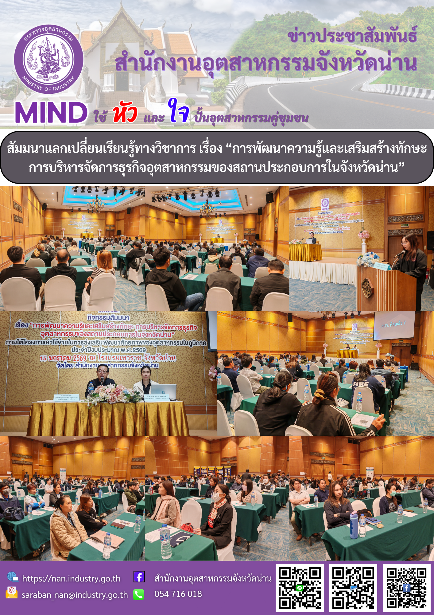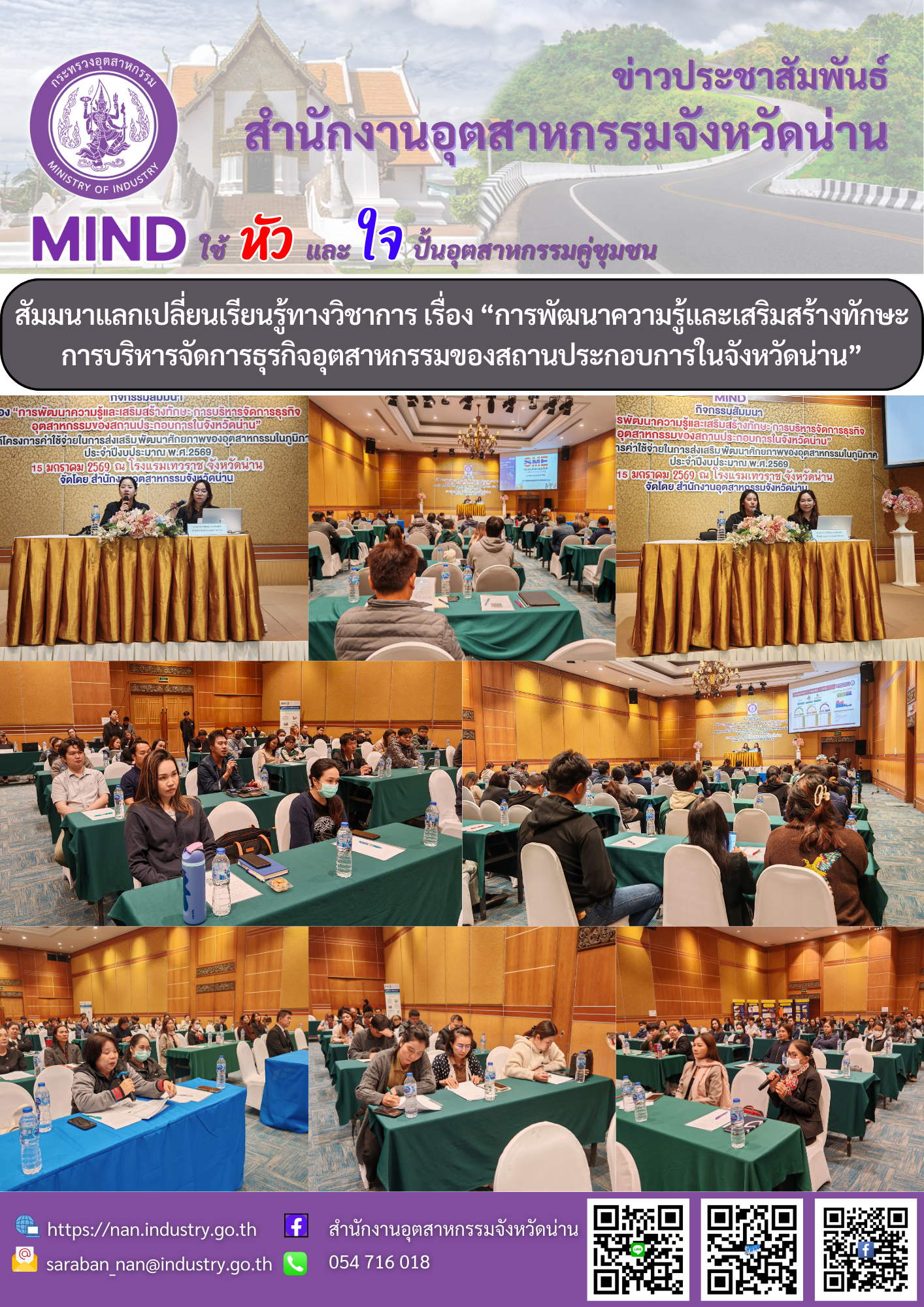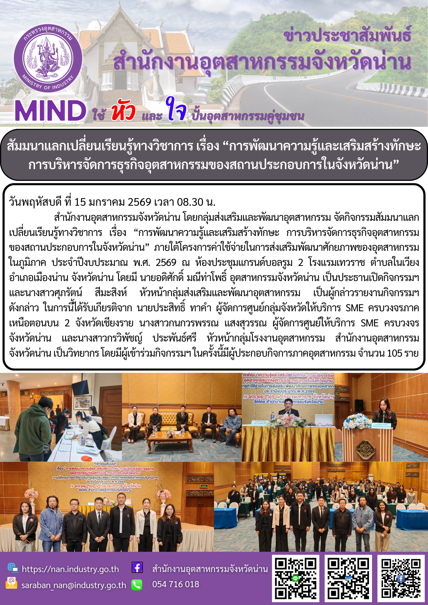 สำนักงานอุตสาหกรรมจังหวัดน่าน โดยกลุ่มส่งเสริมและพัฒนาอุตสาหกรรม จัดกิจกรรมสัมมนาแลกเปลี่ยนเรียนรู้ทางวิชาการ เรื่อง "การพัฒนาความรู้และเสริมสร้างทักษะการบริหารจัดการธุรกิจอุตสาหกรรมของสถานประกอบการในจังหวัดน่าน"ภายใต้โครงการค่าใช้จ่ายในการส่งเสริมพัฒนาศักยภาพของอุตสาหกรรมในภูมิภาค ประจำปีงบประมาณ พ.ศ. 2569 ณ ห้องแกรนด์บอลลูน โรงแรมเทวราช ตำบลในเวียง จังหวัดน่าน โดยมีนายอดิศักดิ์ มณีท่าโพธิ์ อุตสาหกรรมจังหวัดน่าน เป็นประธานเปิดกิจกรรมฯดังกล่าว และนางสาวศุภรัตน์ สีมะสิงห์ หัวหน้ากลุ่มส่งเสริมและพัฒนาอุตสาหกรรม เป็นผู้กล่าวรายงานกิจกรรมฯ ดังกล่าว ในการนี้ได้รับเกียรติจาก นายประสิทธิ์ ทาคำ ผู้จัดการศูนย์กลุ่มจังหวัดให้บริการ SME ครบวงวรภาคเหนือตอนบน 2 จังหวัดเชียงราย นางสาวกนกพรรณ แสงสุวรรณ ผู้จัดการศูนย์ให้บริการ SME ครบวงวรจังหวัดน่าน และนางสาวกรวิพัชญ์ ประพันธ์ศรี หัวหน้ากลุ่มโรงงานอุตสาหกรรม สำนักงานอุตสาหกรรมจังหวัดน่าน เป็นวิทยากร โดยมีผูเข้าร่วมกิจกรรมฯ ในครั้งนี้มีผู้ประกอบการภาคอุตสาหกรรม จำนวน 105 ราย