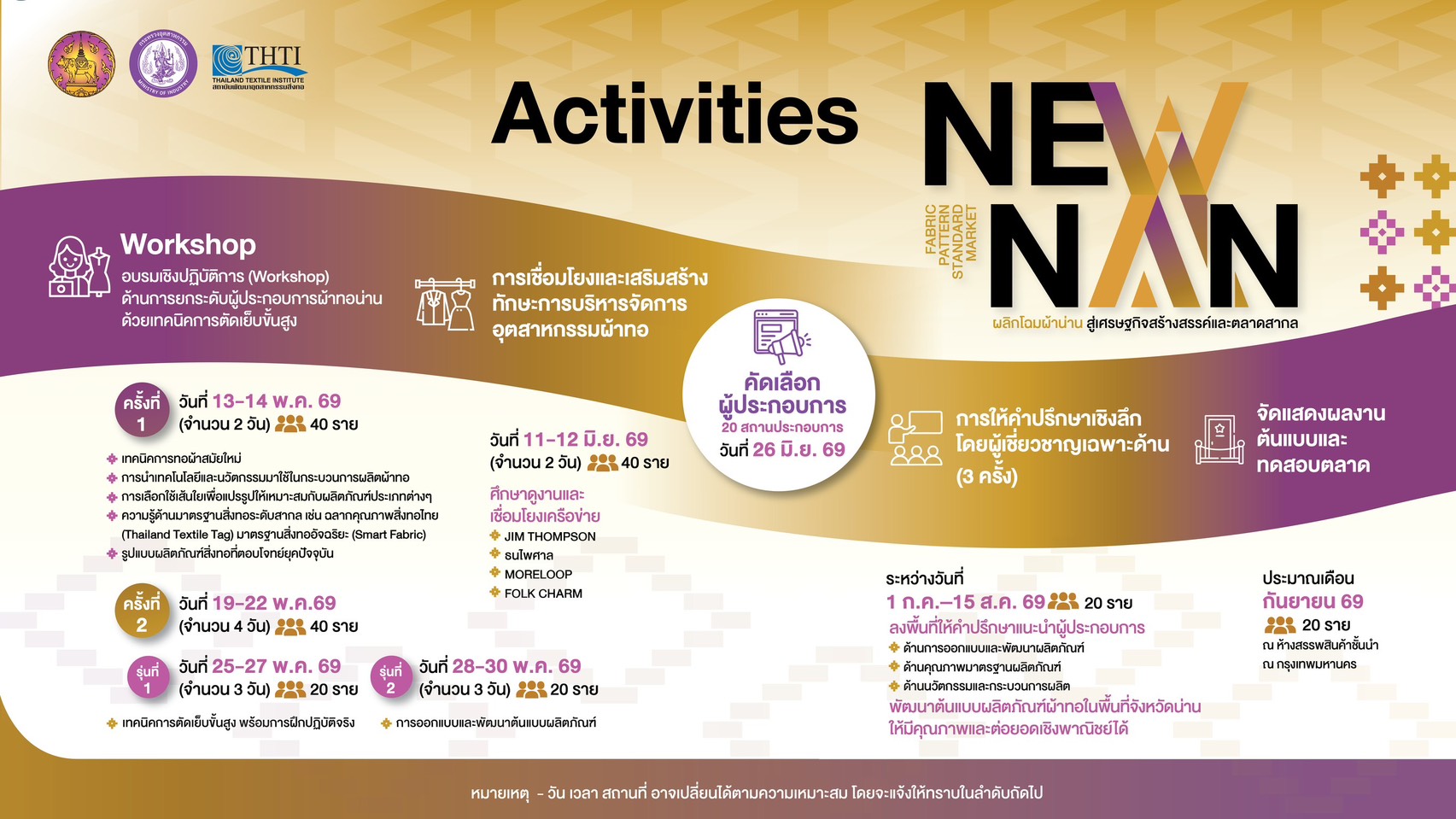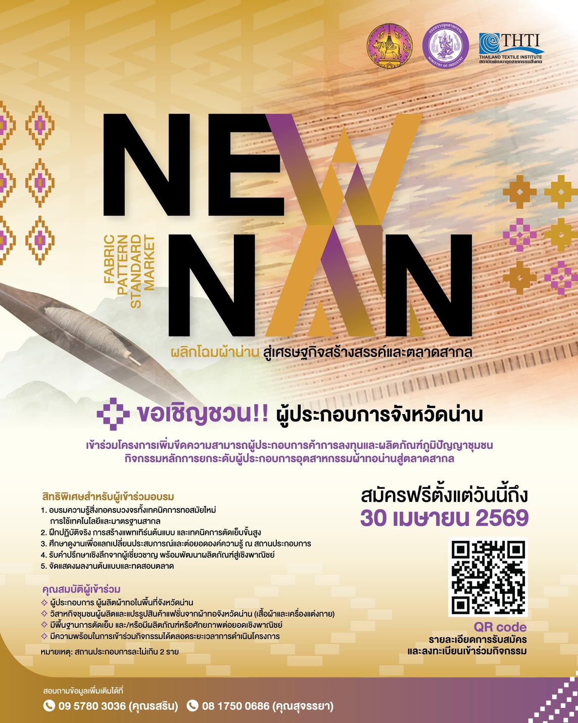 สำนักงานอุตสาหกรรมจังหวัดน่าน ขอเชิญผู้ประกอบการร่วมเป็นส่วนหนึ่งของการขับเคลื่อนครั้งใหม่ ภายใต้โครงการ “เพิ่มขีดความสามารถผู้ประกอบการค้าการลงทุน และผลิตภัณฑ์ภูมิปัญญาชุมชน” กิจกรรมหลัก “การยกระดับผู้ประกอบการอุตสาหกรรมผ้าทอน่าน สู่ตลาดสากล” ประจำปีงบประมาณ พ.ศ. 2569